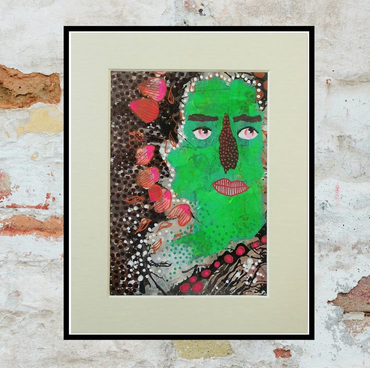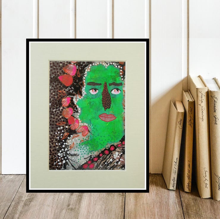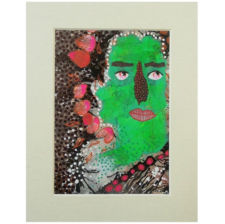 Naive, outsider folk art style artwork ready mounted for you in an 8 x 10 inch ivory card mat with an aperture size of 5.75 x 7.75 inches. This mixed media artwork is so unusual and perfect to slip straight into a standard 8 x 10 inch frame. It is signed on the front and would make a super original art gift for a friend, loved one ..... or even yourself! (Framed photos are for illustration purposes only.)