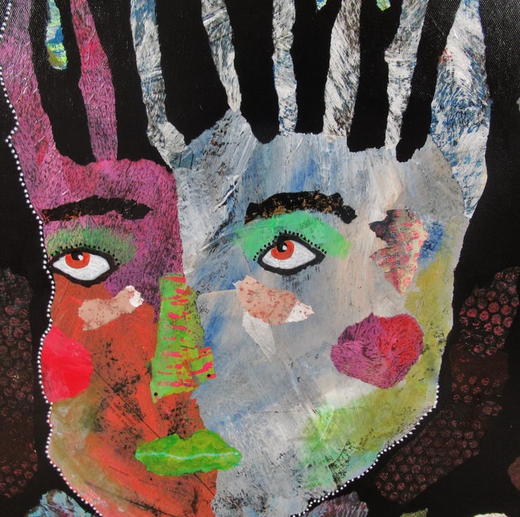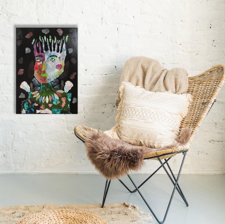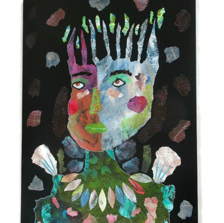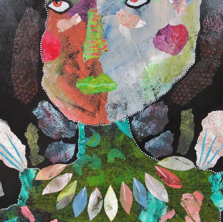 Stunning, large sized hand painted, collaged and illustrated original portrait painting in acrylic, collage and drawing pens on a found stretched vinyl 'canvas' measuring 19.75 x 27.5 inches. The edges of this WOW factor artwork are painted so no framing is necessarily required - simply unpack and hang straight on the wall. It is signed on the edge by Bea and has a soft sheen surface surface.