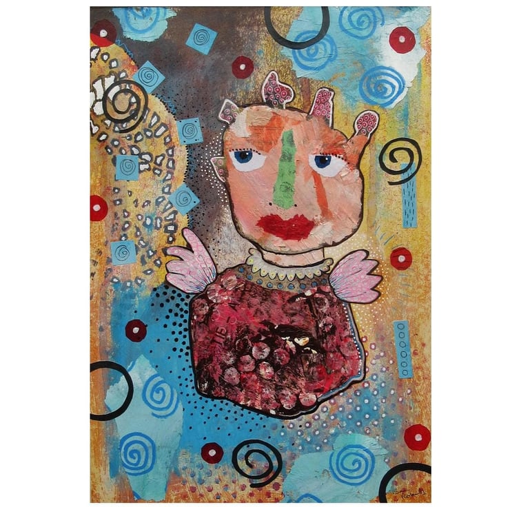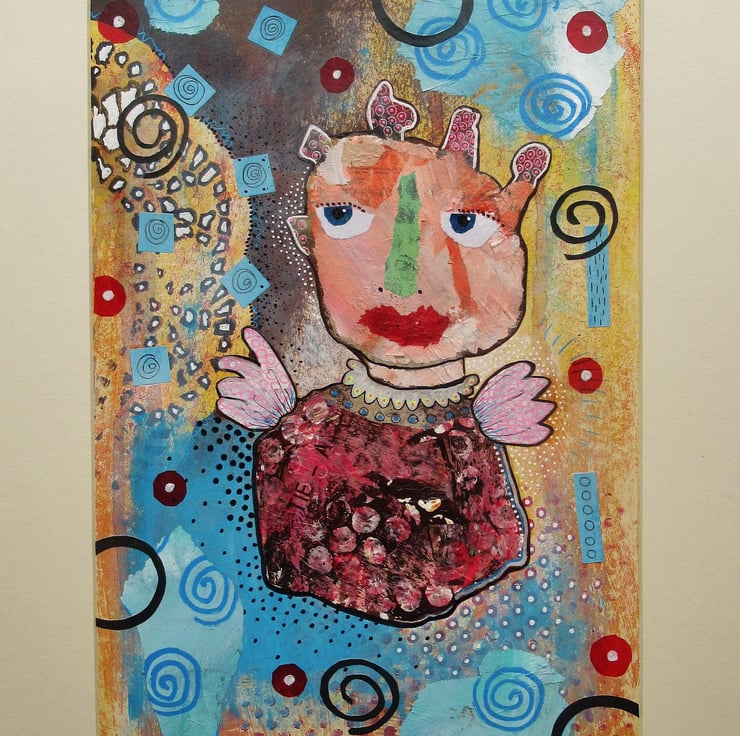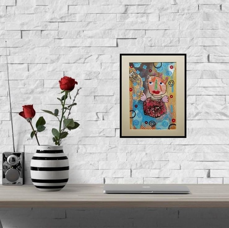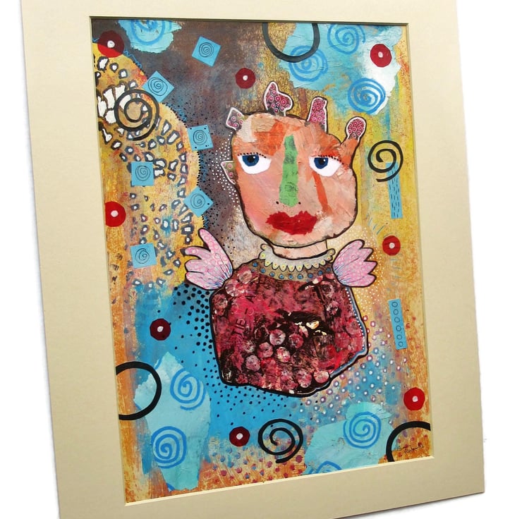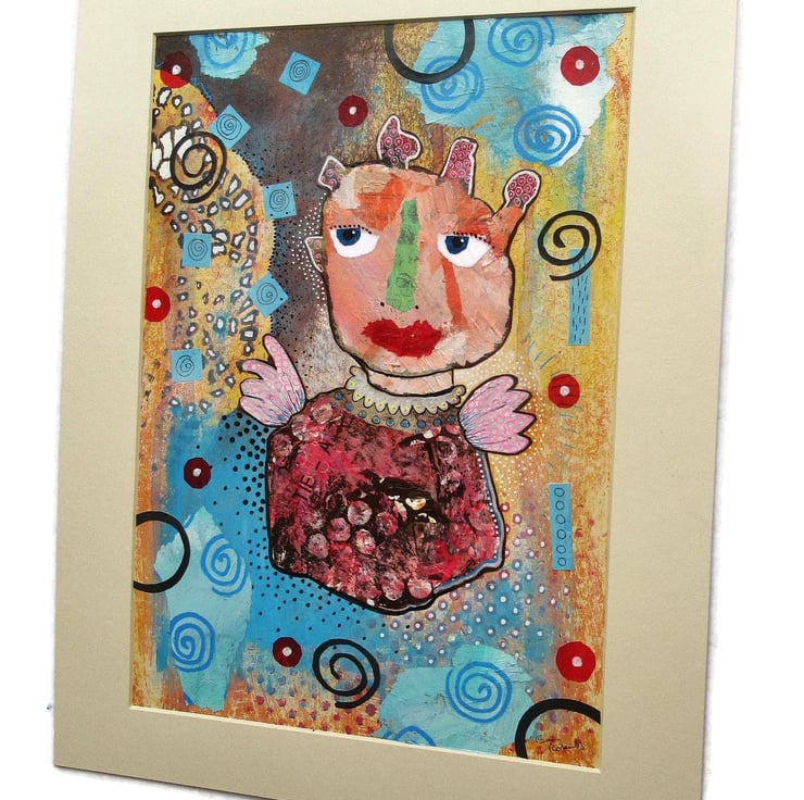 Whimsical, weird, alternative, figurative artwork in acrylic, collage and drawing pens, mounted for you in a 11 x 14 inch ivory card mount with the actual picture size being 8 x 11.5 inches. This artwork is so special - very unusual, quirky, yet ethereal. Perfect to slip straight into any standard sized 11 x 14 inch frame. The artwork is signed on the front and would make an unusual and attractive focal point in any interior.