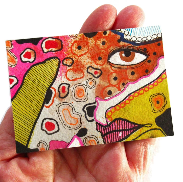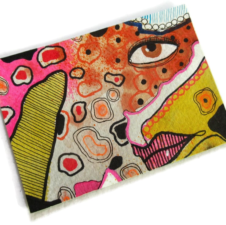 Unusual original abstract eyes painting. Hand painted & drawn watercolour ACEO on heavy watercolour paper, measuring the usual 2.5 x 3.5 inches. Decorative, dreamy and attractive, this tiny artwork would look great in a tiny frame, or with some other ACEOs in a larger frame. It will be discreetly signed on the front by Bea before shipping.