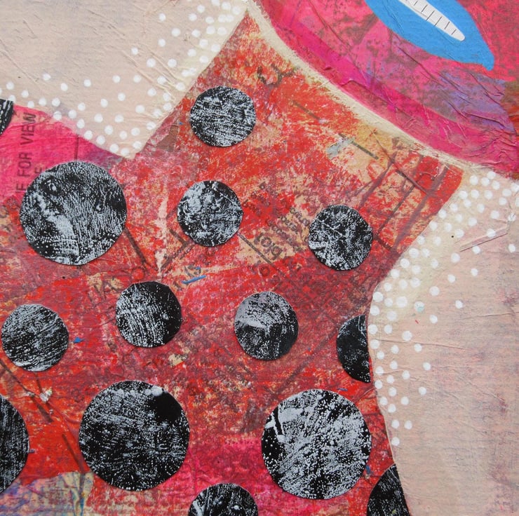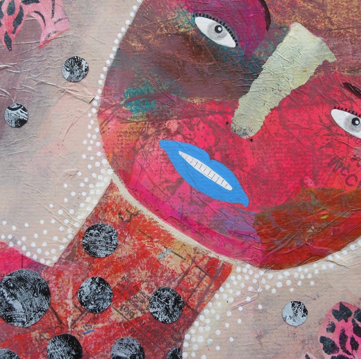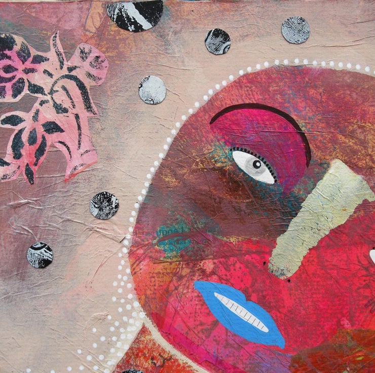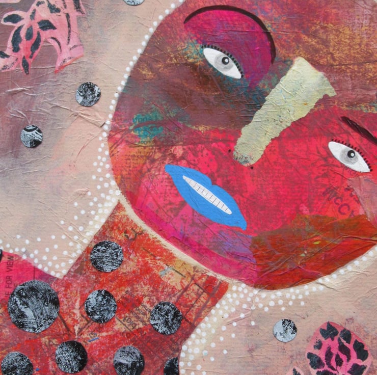 Attractive abstract figurative / portrait painting in acrylic, collage and drawing pens on 10 x 12 inch 2mm deep board. Colourful & quirky figure, predominantly in reds and pinky beige which has a soft sheen surface finish. The artwork is unframed and will be discreetly hand signed on the front by Bea before shipping. Pop straight into any standard sized 10 x 12 inch frame (or mount.)