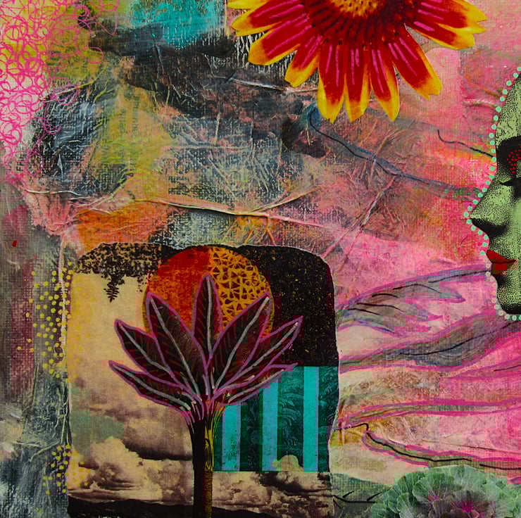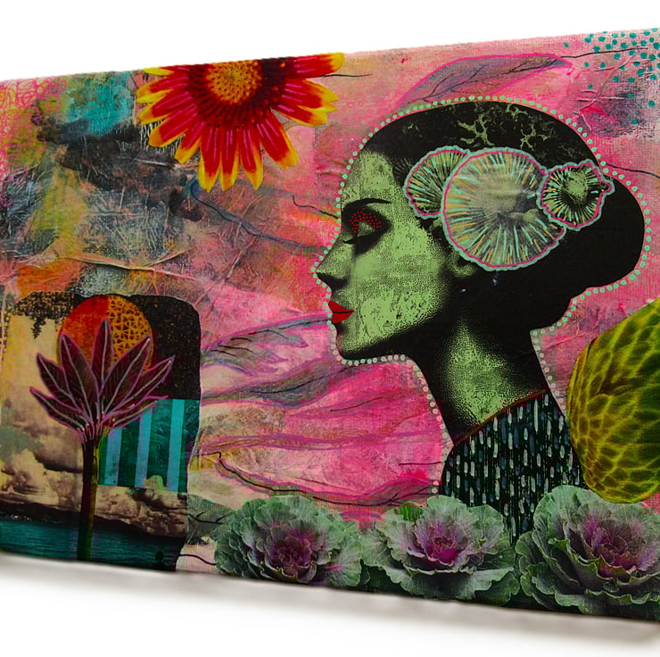 Dreamy, OOAK original artwork in acrylic, collage and drawing pens on 30 x 20 cm (11.75 x 7.75 inch) canvas with painted edges so no framing is necessarily required - just unpack and hang. This ethereal feminist artwork blends bold colour, collage elements, textures and hand drawn details and is perfect for art lovers who appreciate unique, eclectic, and imaginative wall décor. It would also make a thoughtful gift for and art loving friend or loved one. Your artwork will be hand signed on the front by Bea before shipping and has a soft sheen surface finish.