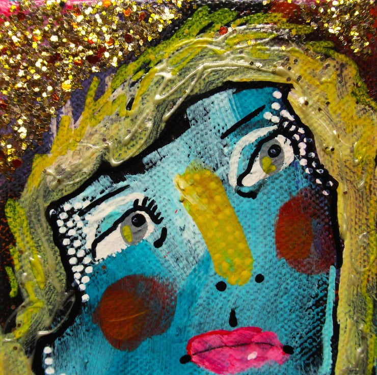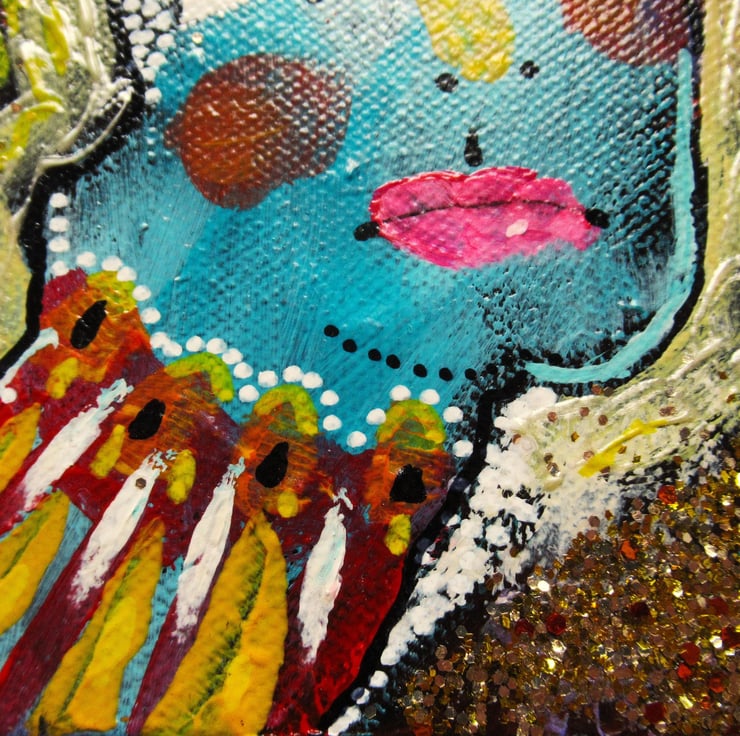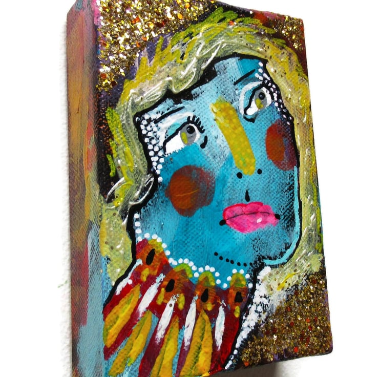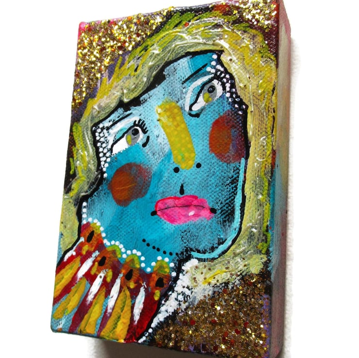 Quirky small miniature original outsider art style painting in acrylic, drawing pens and added glitter, on a 4 x 6 inch deep edge canvas, the 1.5 inch edges of which are painted. This jewel toned and shimmery, glittery artwork has definite 'WOW' factor, even though it is wee. It is signed up the edge by Bea and has a soft sheen surface finish. As the canvas is deep edged, it has the appearance of a block, therefore it can be either hung on the wall, or stood up on a surface like a standing ornament.