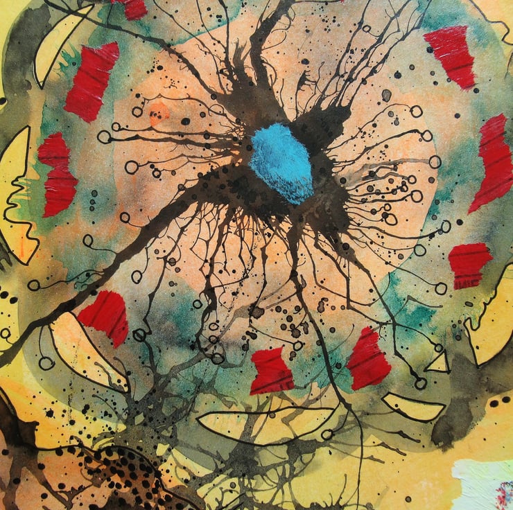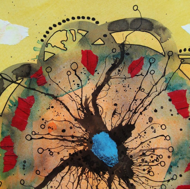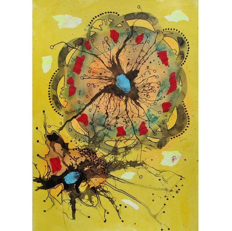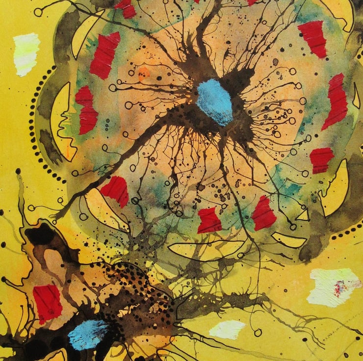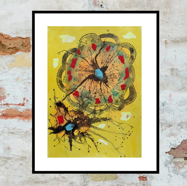 Attractive abstract painting which combines watercolour, ink, drawing pens & collage on watercolour paper. Measuring a 8.25 x 11.75 inches (UK size A4) it can be conveniently popped straight into any standard A4 frame or mount. This attractive artwork which, is reminiscent of a flower, looks quite minimal, but there is actually loads going on, with it's beautiful colour nuances, ink drifts, rivulets and splashes and the more you look at it, the more you can see. It will be signed on the front by Bea before shipping and it is unframed. (Framed phots are for illustration purposes only.)