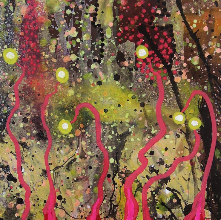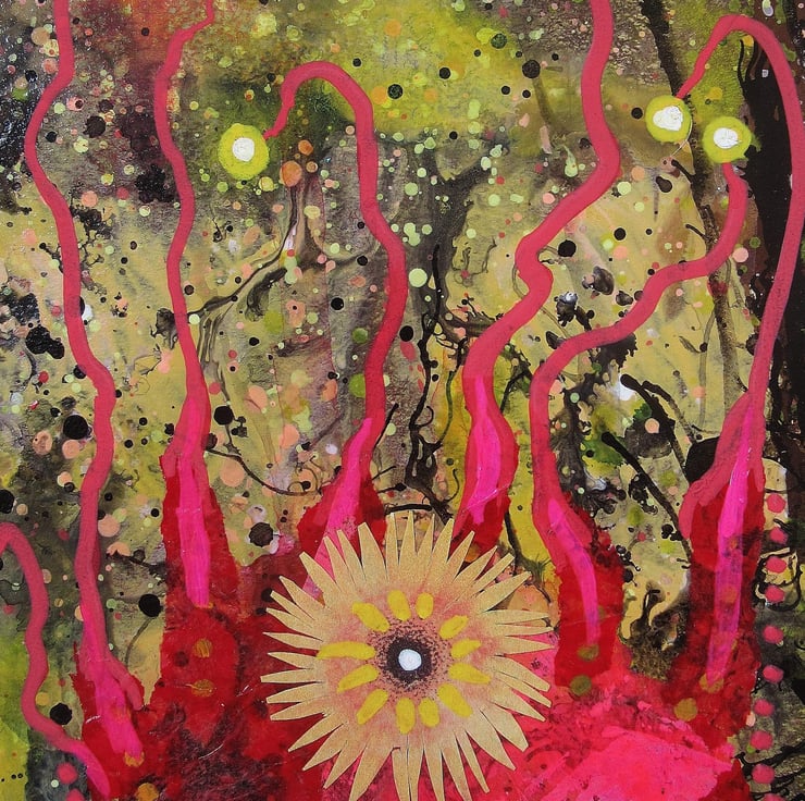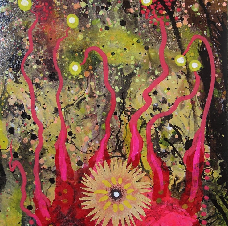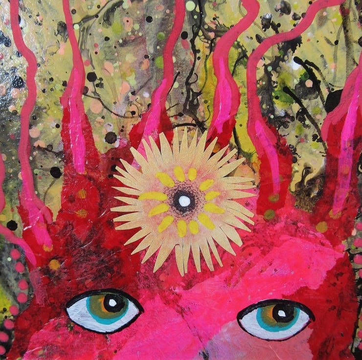 Unusual and colourful, smaller format painting in acrylic, collage and drawing pens, ready mounted in a 8 x 10 inch ivory card mat with the aperture (picture size) of 5.75 x 7.75 inches. This quirky, vibrant artwork is perfect to slip straight into any standard sized 8 x 10 inch frame. It is signed on the front by Bea and would make a striking focal point in any small space. (Framed photos are for illustrative purposes only.)