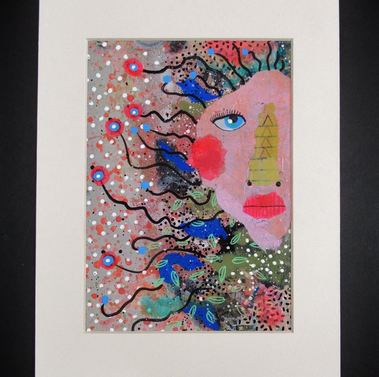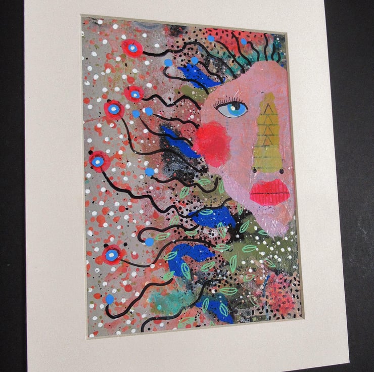 Raw, primitive, ready matted small format portrait painting in acrylic, collage and drawing pens. In a 8 x 10 inch ivory card mat with an aperture (picture size) of 5.75 x 7.75 inches, this artwork is so unusual and expressive and perfect to slip straight into any standard 8 x 10 inch frame. The painting is signed on the front by Bea and would make a gorgeous focal point in any small space. (Framed photos are for illustrative purposes only.)