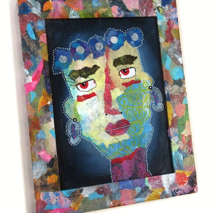 Funky, colourful and unusual artwork on board in acrylic, oil pastel and collage, ready mounted in a wooden frame which I have collaged all over to match the artwork. The frame measures 11 x 14.5 inches and the aperture (picture size) is 8 x 11.75 inches. The artwork will be discreetly signed on the front by Bea before dispatch and has soft sheen surface finish. PLEASE NOTE- the frame is unglazed (without glass in it.)