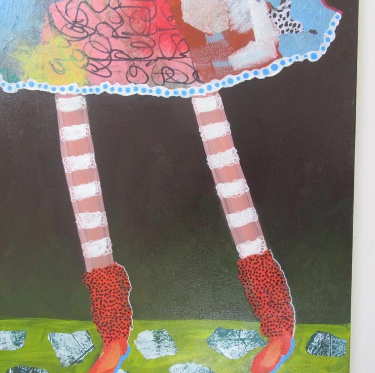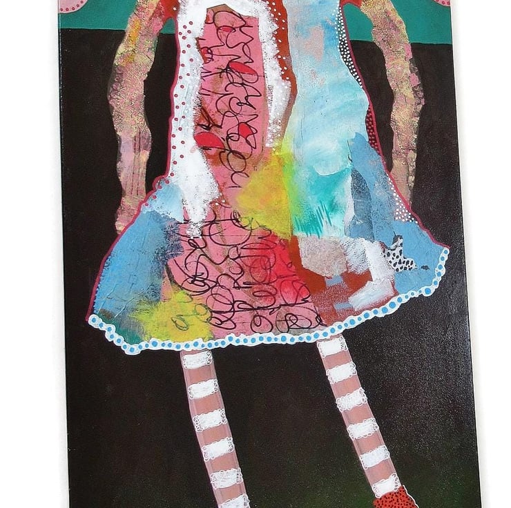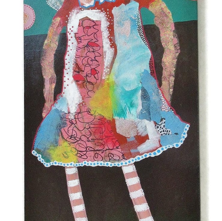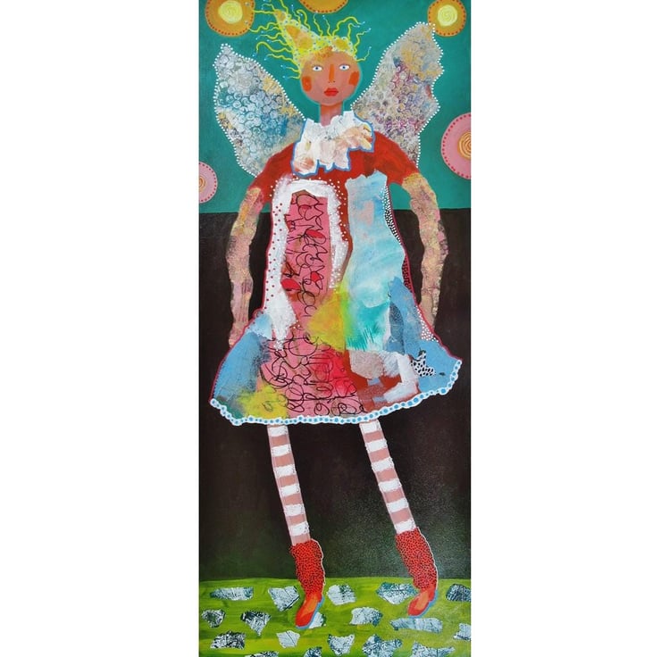 Naive style large mixed media figurative angel painting in acrylic and collage on a found / reused 13.75 x 35.25 inch stretched vinyl 'canvas' with painted edges so no framing is required. Just unpack and hang. Quirky, folk art style painting which is signed up the edge by Bea and which has a soft sheen finish. Unusual, outsider, primitive original artwork which would make a super focal point in any interior.