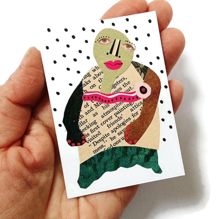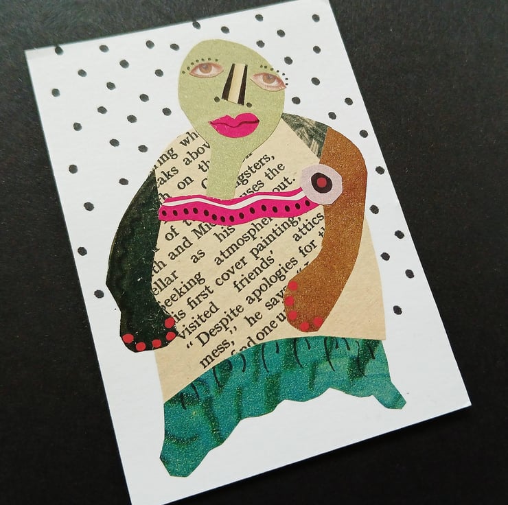 Quirky, slightly weird, collage ACEO mini artwork. Measuring 2.5 x 3.5 inches and created using vintage magazine paper. This quirky figure would make an attractive and unusual focal point on a shelf, mantelpiece, dressing table or windowsill. Alternatively just hang on the wall in a tiny frame. Ideal for grouping or framing with other ACEOs to make a larger artwork, it is hand signed on the reverse by Bea.