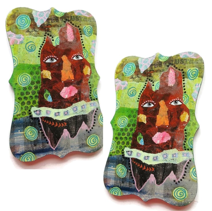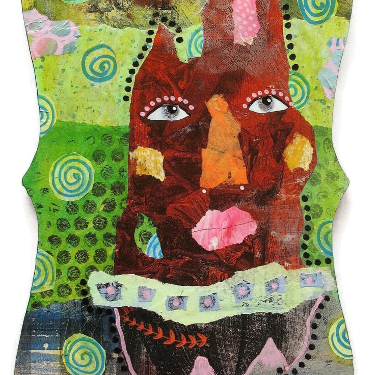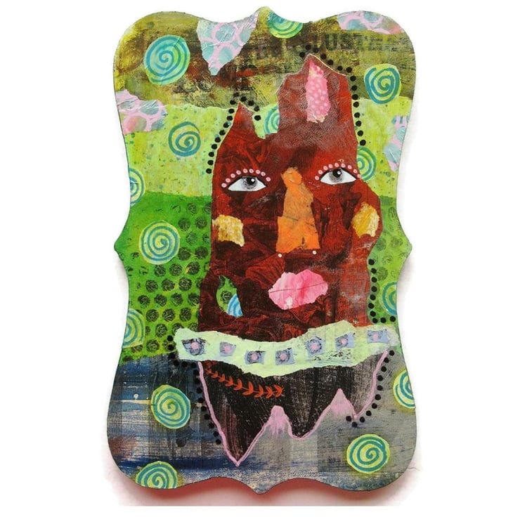Original artwork on a found wooden MDF shaped panel in a combination of acrylic, collage and drawing pens. In an elegant curvy shape with hanger on the back, the edges are painted and the panel measures 12 x 7.5 inches at longest widest parts. It has a soft sheen finish and will be signed on the front by Bea before dispatch.