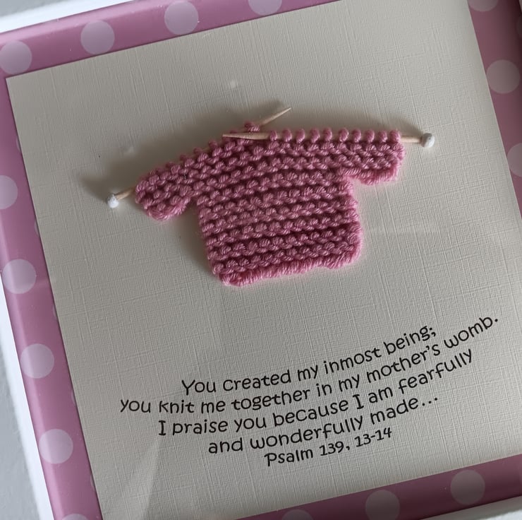 The knitted jumper is knitted by me in fine dusky pink yarn and then transferred onto my handmade tiny knitting needles. The text from Psalm 139 is printed on cream card and it is stuck on a pink spotty background. The frame is white and it's size is 22.5cm x 22.5cm (just under 9"). The frame can be hung or stood. There is clear perspex instead of glass. Just as good but less fragile.