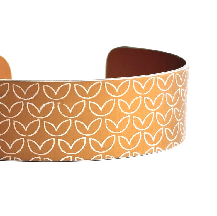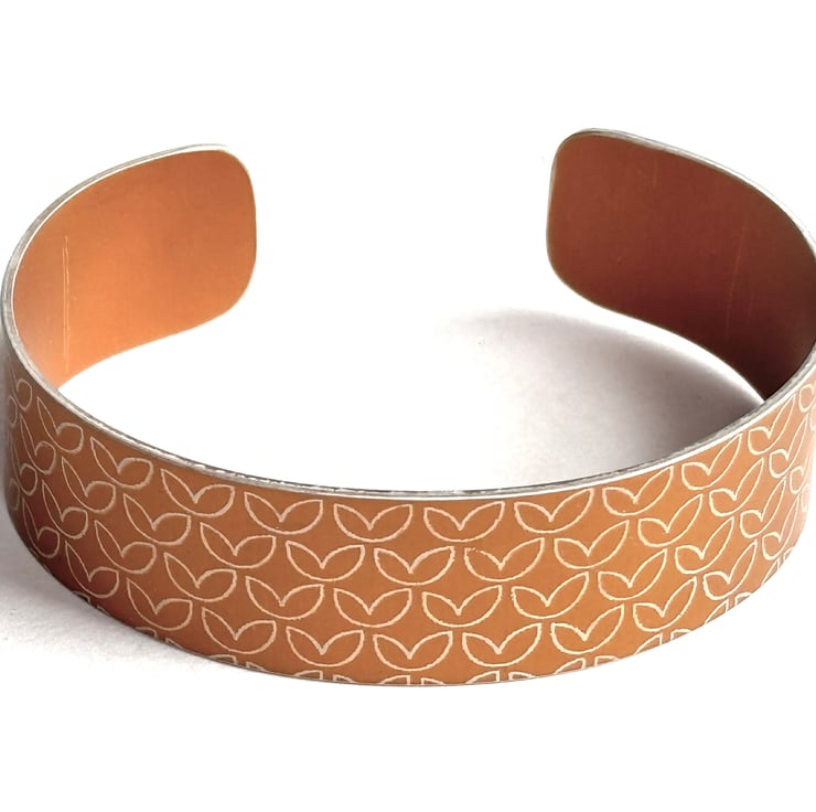 A striking bracelet/cuff made from anodised aluminium with a leaf pattern from my own hand drawing. I made the drawing into a resist and applied it to the metal. I then dye the aluminium, seal it and remove the resist which leaves the pattern showing in the original colour of the metal. The cuff is then made using traditional metalworking techniques.