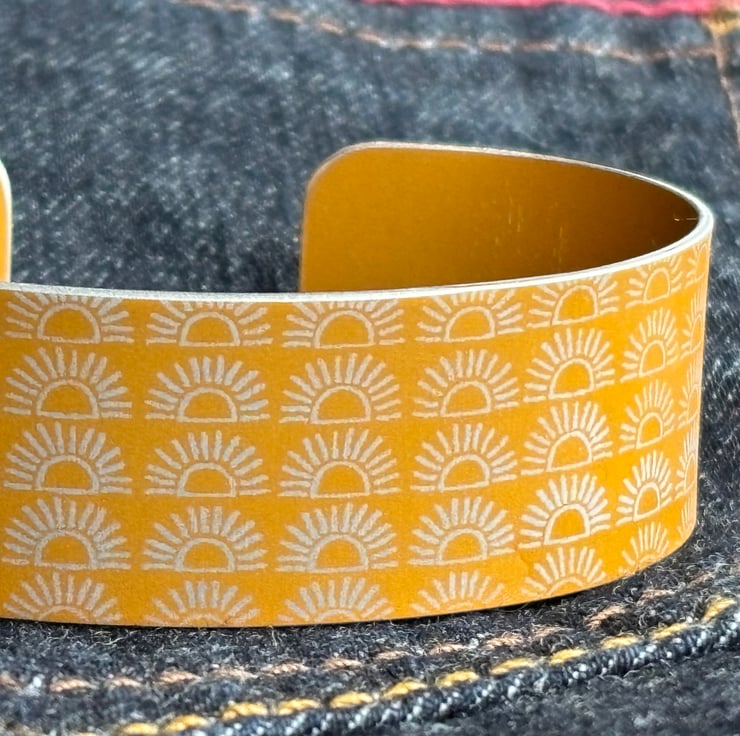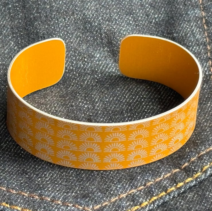 A stylish bracelet/narrow cuff made from anodised aluminium with a print of little suns. I drew this pattern digitally, made it into a resist and applied it to the metal. I then dye the aluminium, seal it and remove the resist which leaves the pattern showing in the original colour of the metal. The cuff is then made using traditional metalworking techniques.