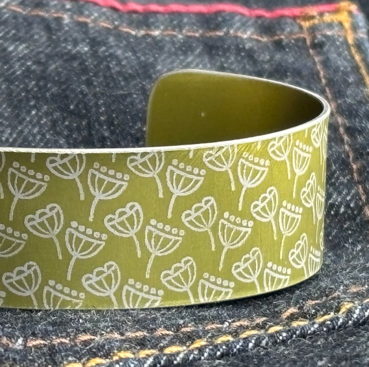 A quirky bracelet/narrow cuff made from anodised aluminium with a mini print of seed heads. I drew this pattern digitally, made it into a resist and applied it to the metal. I then dye the aluminium, seal it and remove the resist which leaves the pattern showing in the original colour of the metal. The cuff is then made using traditional metalworking techniques.