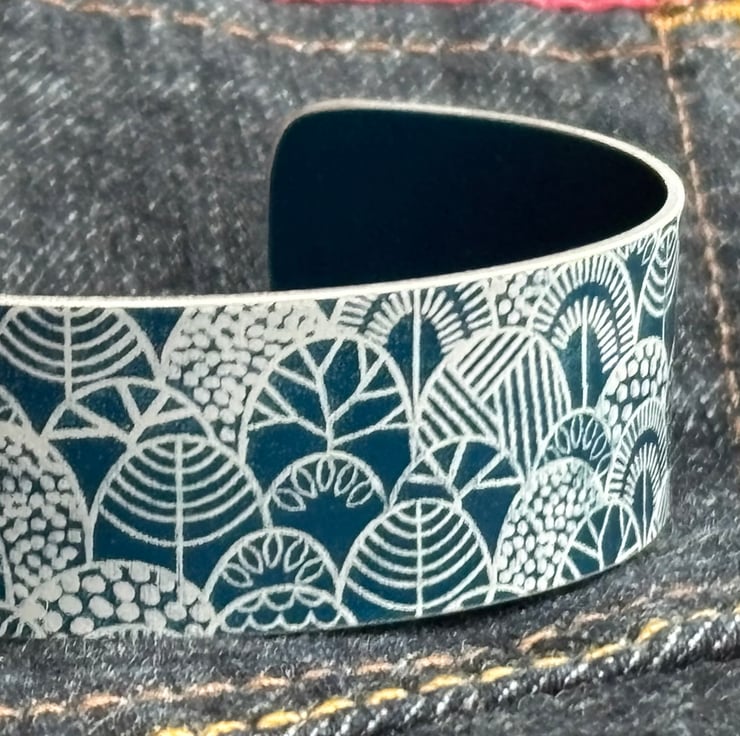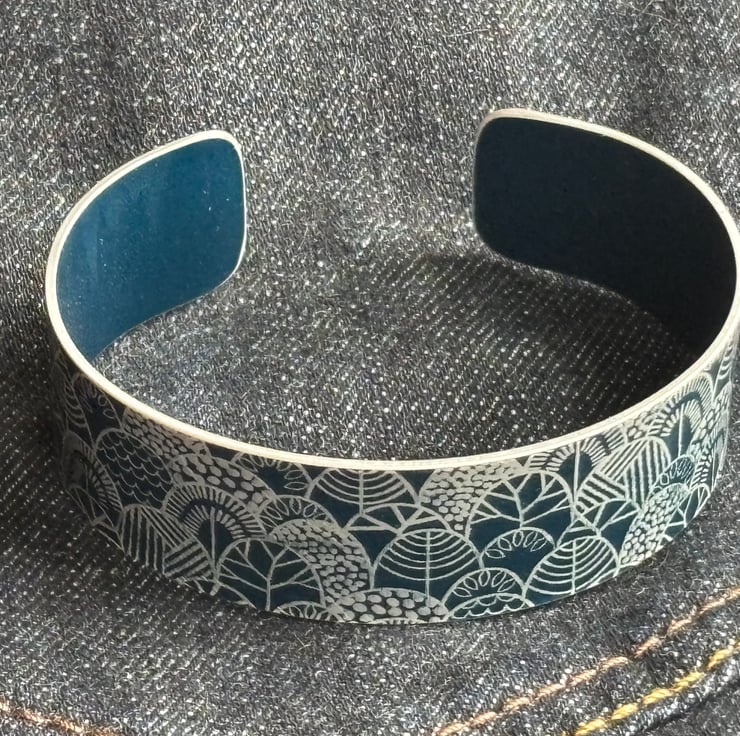 A stylish bracelet/narrow cuff made from anodised aluminium with a print of stylised trees. I drew this pattern digitally, made it into a resist and applied it to the metal. I then dye the aluminium, seal it and remove the resist which leaves the pattern showing in the original colour of the metal. The cuff is then made using traditional metalworking techniques.