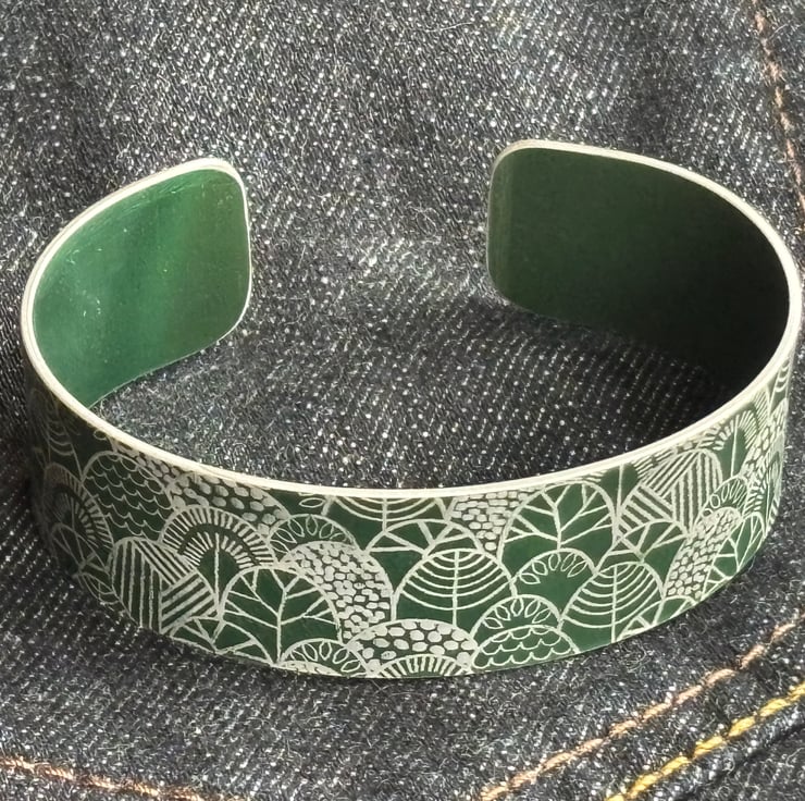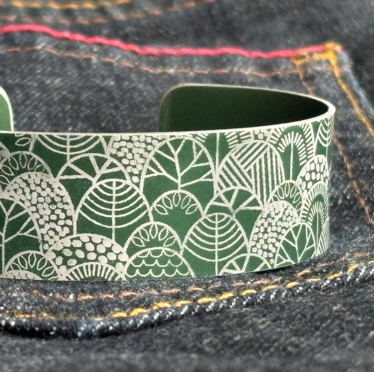 A stylish bracelet/narrow cuff made from anodised aluminium with a print of stylised trees. I drew this pattern digitally, made it into a resist and applied it to the metal. I then dye the aluminium, seal it and remove the resist which leaves the pattern showing in the original colour of the metal. The cuff is then made using traditional metalworking techniques.