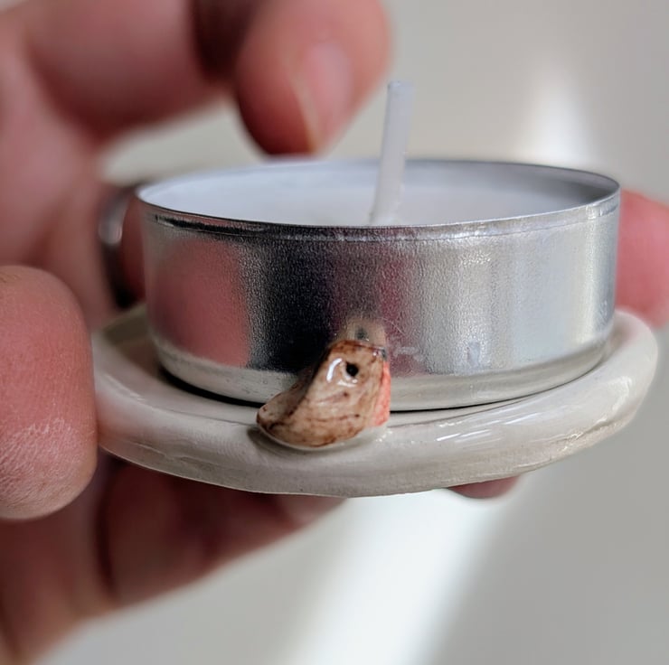 Small pottery tea light candle holder with a tiny hand modelled robin perched on the side in white clay and clear shiny glaze .