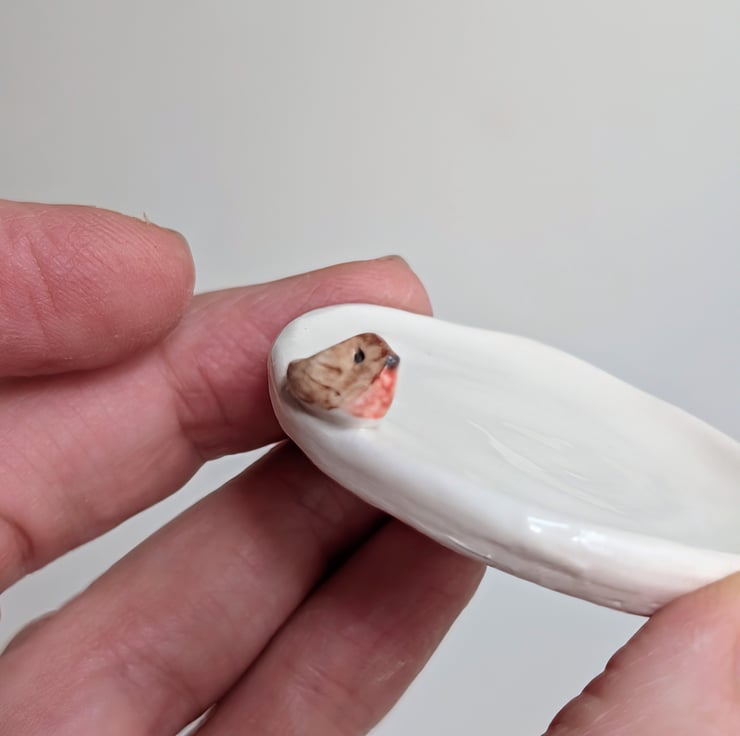 Hand thrown little pot from a small ball of clay . Once trimmed, the tiniest of handmade robins was attached prior to bisque firing . The robin was then hand painted, and the whole pot dipped in clear lead-free glaze prior to the final firing