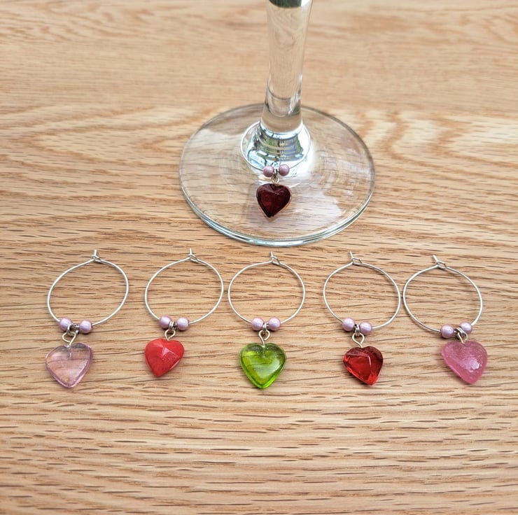 Set of 6 Wine Glass Charms with Pale-Pink Miracle Beads & Coloured Heart Charms
