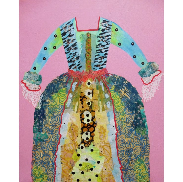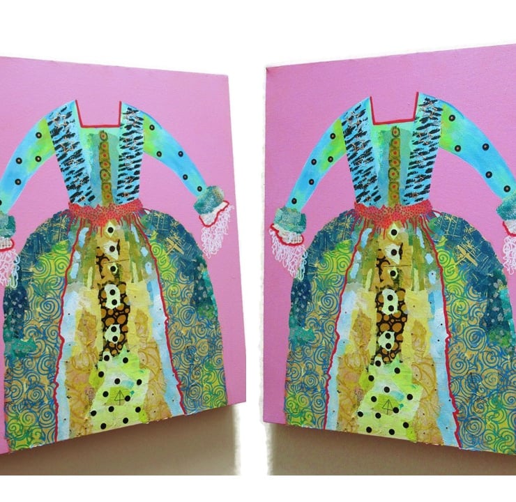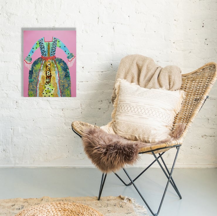 Quirky, unusual, original painting in acrylic and collage on 16 x 20 inch found stretched vinyl 'canvas' with deep 1.5 inch edges which I have painted so no framing is required. In lovely bright bold colour with gold details and pretty aurora borealis shimmer medium on the dress. As this is an upcycled ground there is s light wrinkle on the edge - see last photo. This is not massively detrimental, but worth mentioning. This unusual artwork is signed up the edge by Beatrice and has a soft sheen surface finish. Perfect for boho / bohemian homes or someone who likes something a little different.