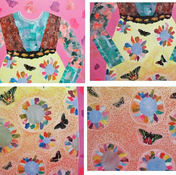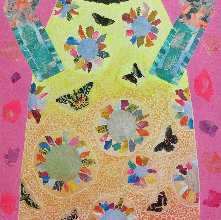 Large, colourful and unusual. Original artwork in acrylic and collage on 19.5 x 39 inch found stretched vinyl 'canvas' with 1.5 inch deep inch edges. In uplifting, bright colours with gold details and collage butterflies on the dress. The edges of the canvas are painted so no framing is required. This is an imposing original, hand crafted piece of art which is signed up the edge by Beatrice and which has a soft sheen surface finish. Quirky and unusual - perfect for boho / bohemian homes.