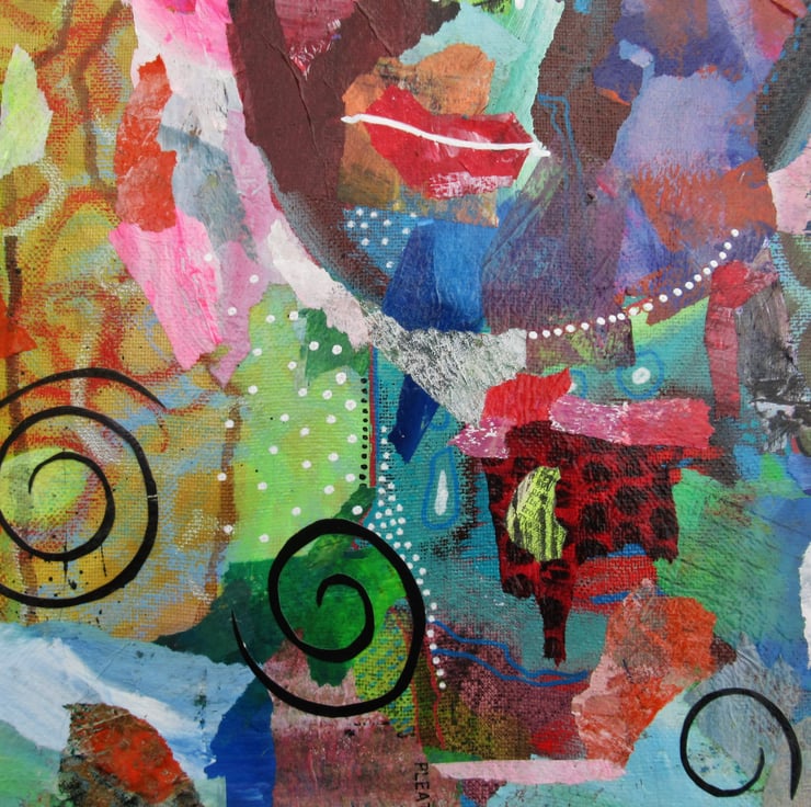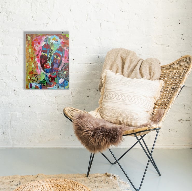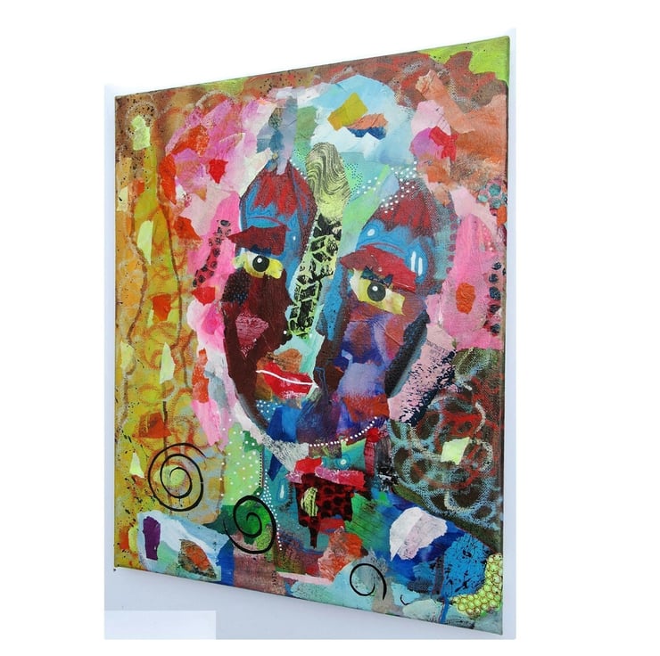 Colourful and quirky mixed media, abstract portrait painting in acrylic and collage on 14 x 18 inch stretched canvas with painted edges so no framing is necessarily required - just unpack and hang. Slightly surreal, jewel toned artwork which is is signed up the edge by Beatrice and has a soft sheen surface finish.