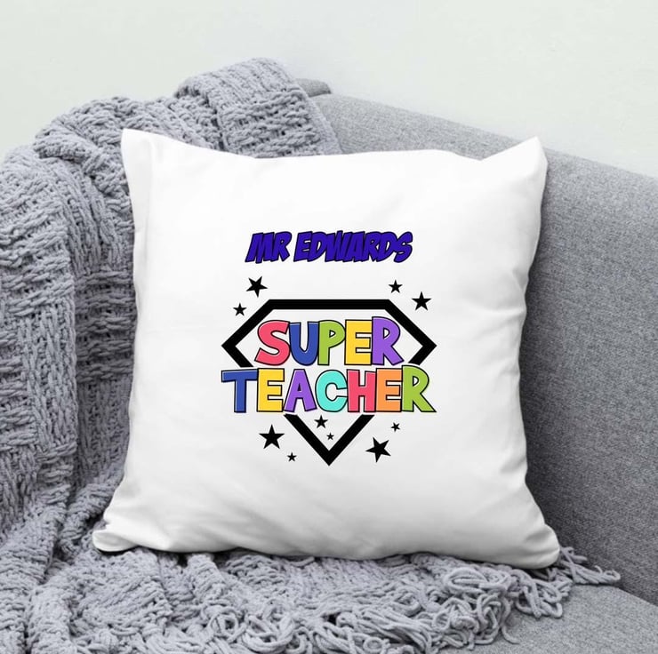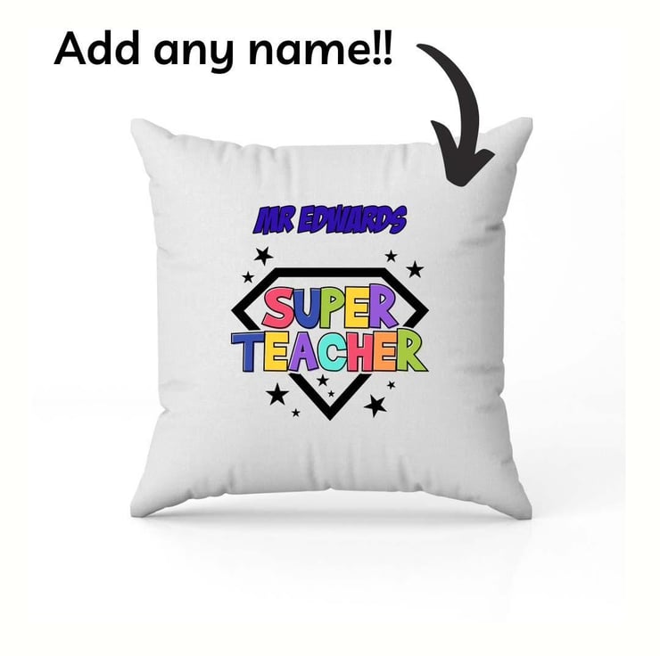 Give the gift of comfort and fun with this personalized "Super Teacher" cushion cover! Featuring a superhero-inspired logo that says "Super Teacher," this cushion cover can be customized with a teacher's name in a bold comic book style font. Perfect for both male and female teachers, it makes a unique end-of-term gift to show appreciation for their hard work and dedication. A great addition to any teacher's home or classroom, this cushion cover is not only a thoughtful gift but also a stylish d cor piece they ll cherish.