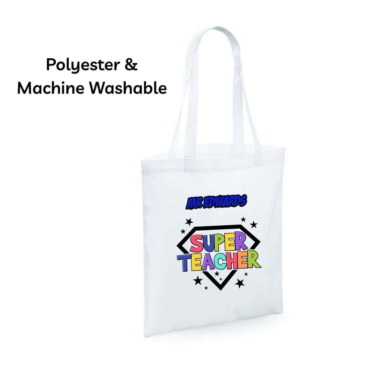 Show your appreciation with this fun and stylish "Super Teacher" tote bag! Featuring a superhero-inspired logo that says "Super Teacher," this tote bag can be personalized with a teacher's name in a bold comic book font. Perfect for both male and female teachers, it makes a thoughtful end-of-term gift to celebrate their hard work. This high-quality tote is both practical and personalized, making it ideal for carrying books, supplies, or groceries. A perfect gift for Teacher Appreciation Week, birthdays, or just to show your thanks!