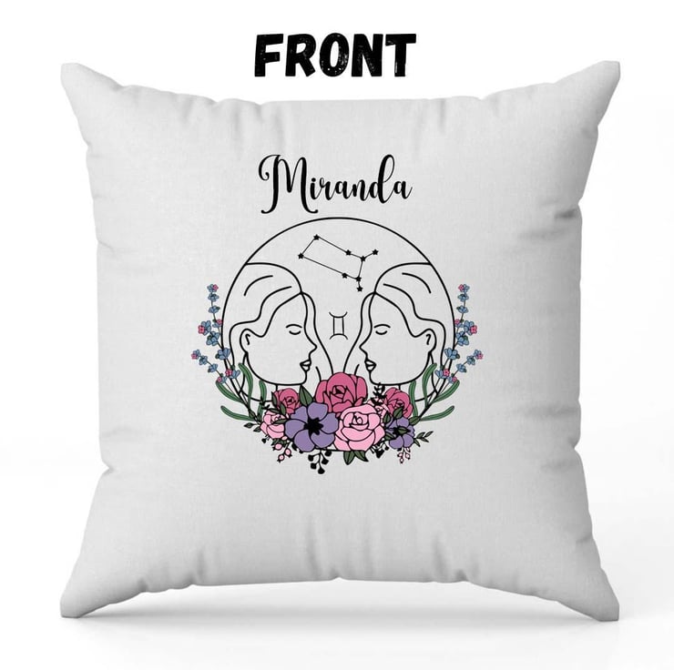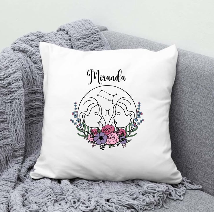 Delight the Gemini in your life with this beautifully personalized cushion cover, designed to capture the essence of the Gemini star sign. This design features the iconic symbol of the twins, elegantly intertwined with a charming floral pattern. It s the perfect blend of astrology and nature, making it a meaningful and thoughtful gift for any Gemini. Whether you're searching for a standout birthday gift or a special Mother s Day present, this personalized cushion cover is sure to be cherished for years to come.