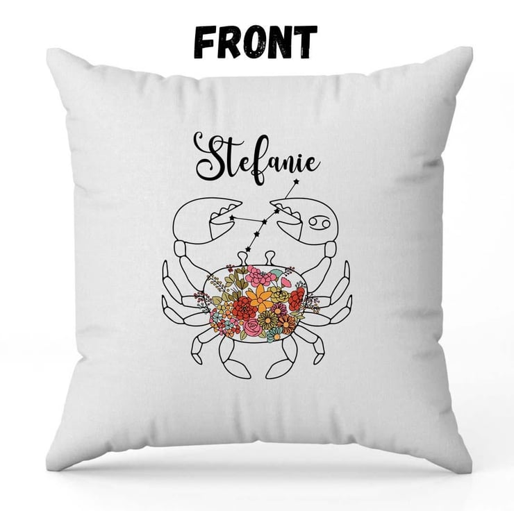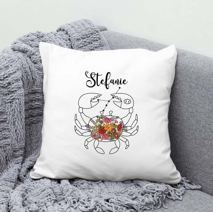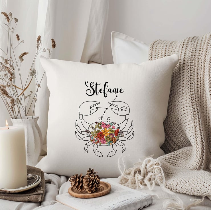 Celebrate the deep emotions and intuitive nature of the Cancer star sign with this beautifully designed personalised cushion cover. Featuring an elegant floral crab illustration, this astrology-inspired pillowcase makes a meaningful and stylish addition to any home. Crafted from high-quality fabric, it offers both comfort and durability, making it a perfect keepsake for Cancer-born individuals.