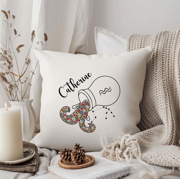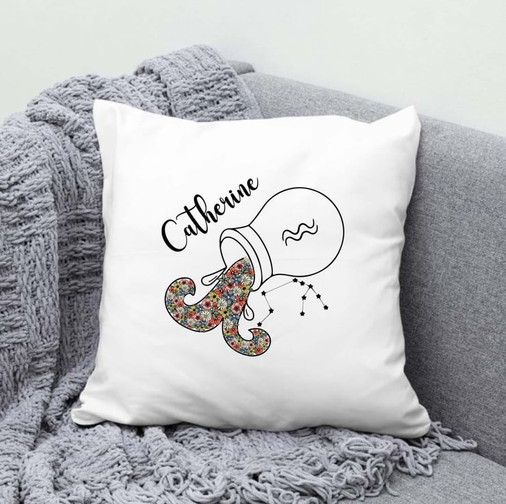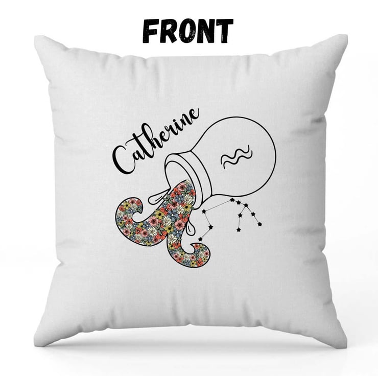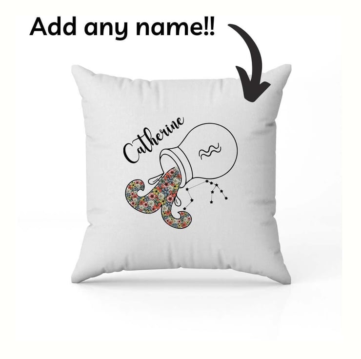 Celebrate the independent and visionary spirit of Aquarius with this stunning personalised cushion cover. Thoughtfully designed with an artistic depiction of the Aquarius symbol, this pillowcase features a beautifully detailed water jug adorned with delicate floral elements, making it a truly unique and meaningful piece for astrology enthusiasts.