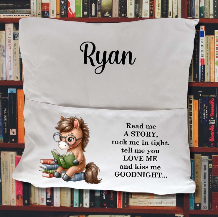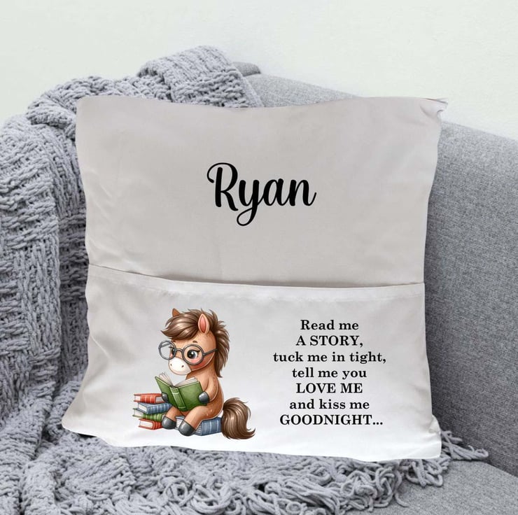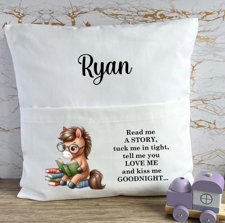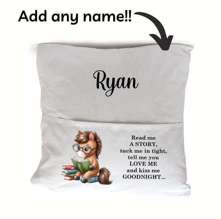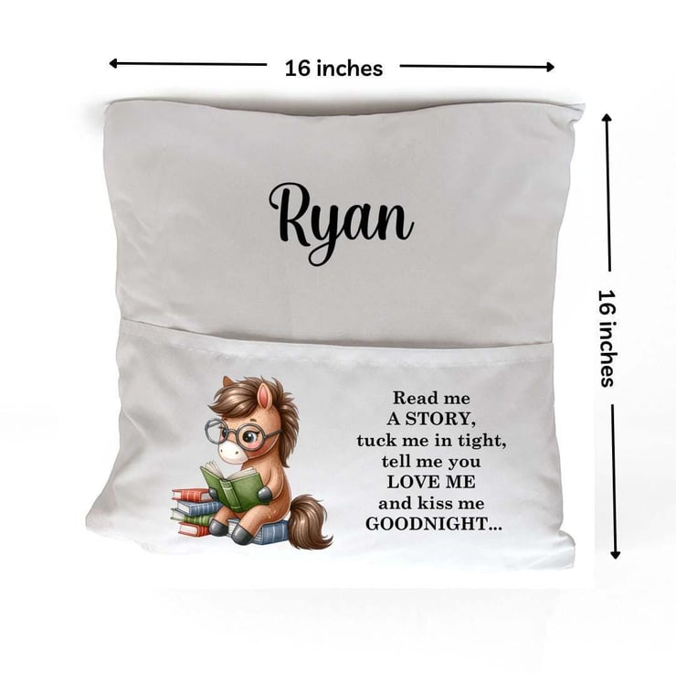 The cushion cover features a charming horse pony illustration alongside the sweet, bedtime phrase: "Read me a story, tuck me in tight, tell me you love me, and kiss me goodnight." Each cushion cover can be personalized with your child's name, creating a unique, keepsake gift that will be treasured for years to come.
