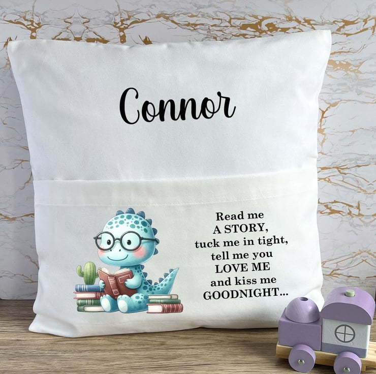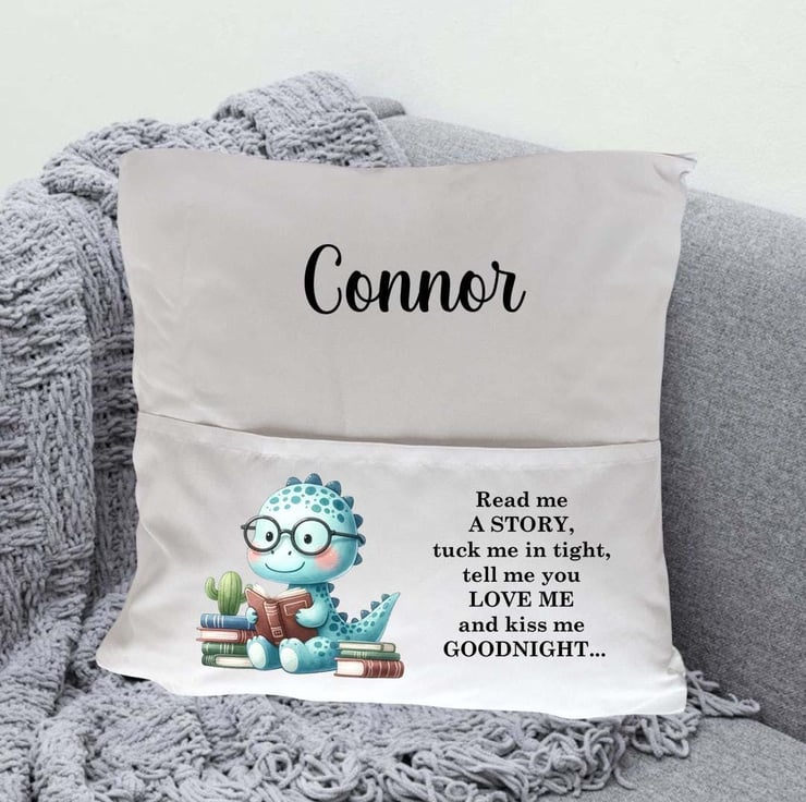 The cushion cover features a charming dinosaur illustration alongside the sweet, bedtime phrase: "Read me a story, tuck me in tight, tell me you love me, and kiss me goodnight." Each cushion cover can be personalized with your child's name, creating a unique, keepsake gift that will be treasured for years to come.