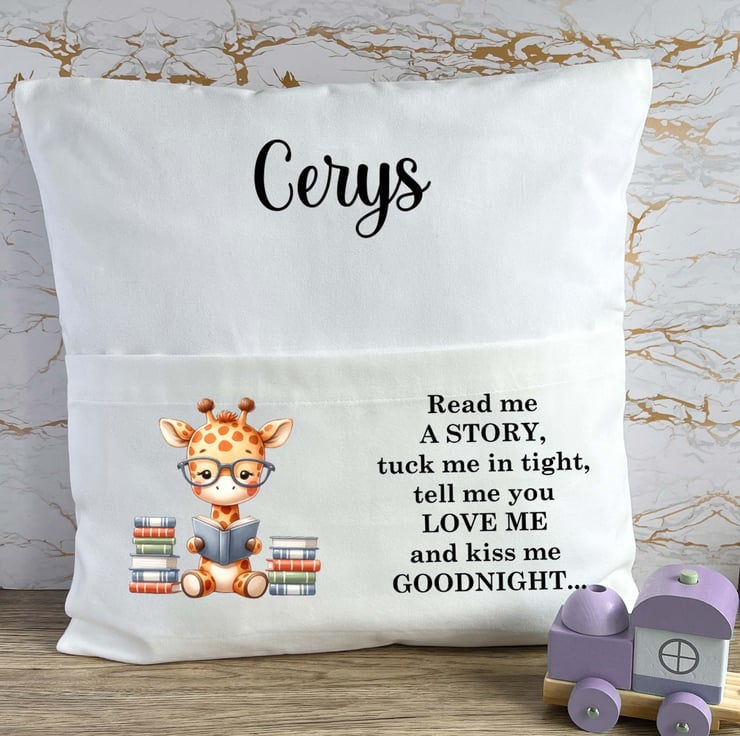 The cushion cover features a charming Giraffe illustration alongside the sweet, bedtime phrase: "Read me a story, tuck me in tight, tell me you love me, and kiss me goodnight." Each cushion cover can be personalized with your child's name, creating a unique, keepsake gift that will be treasured for years to come.