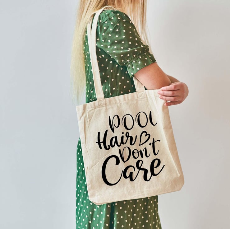 Featuring the fun and stylish "Pool Hair Don't Care" design, this lightweight yet durable tote is ideal for carrying your swimsuit, sunscreen, beach cover-up, and summer essentials. It's also great for holding your books, sunglasses, and snacks as you relax on a sun lounger.