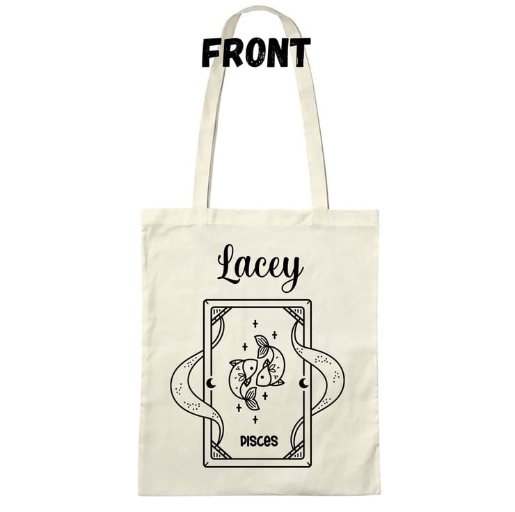 Celebrate intuition and creativity with this beautifully designed natural cotton tote bag, featuring a striking Pisces illustration. Perfect for astrology lovers, this versatile bag combines style and function with its eco-friendly, durable material and spacious design. Add a personal touch by customizing it with any name, making it an ideal gift for birthdays, special occasions, or as a thoughtful keepsake. Whether for everyday use, shopping, or as a unique statement piece, this tote bag is both practical and meaningful, perfect for anyone who embodies the dreamy and compassionate Pisces spirit.