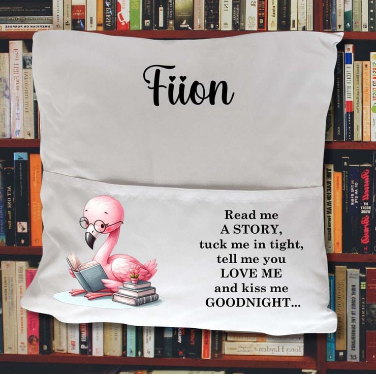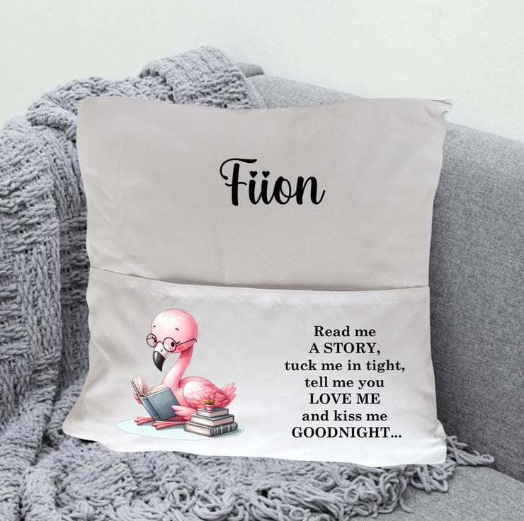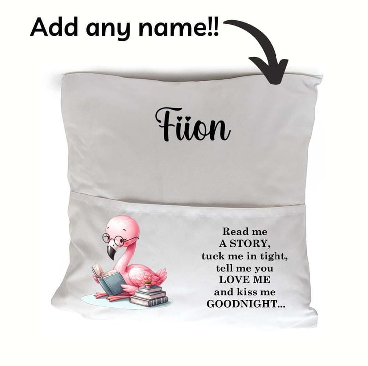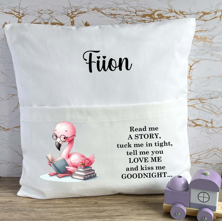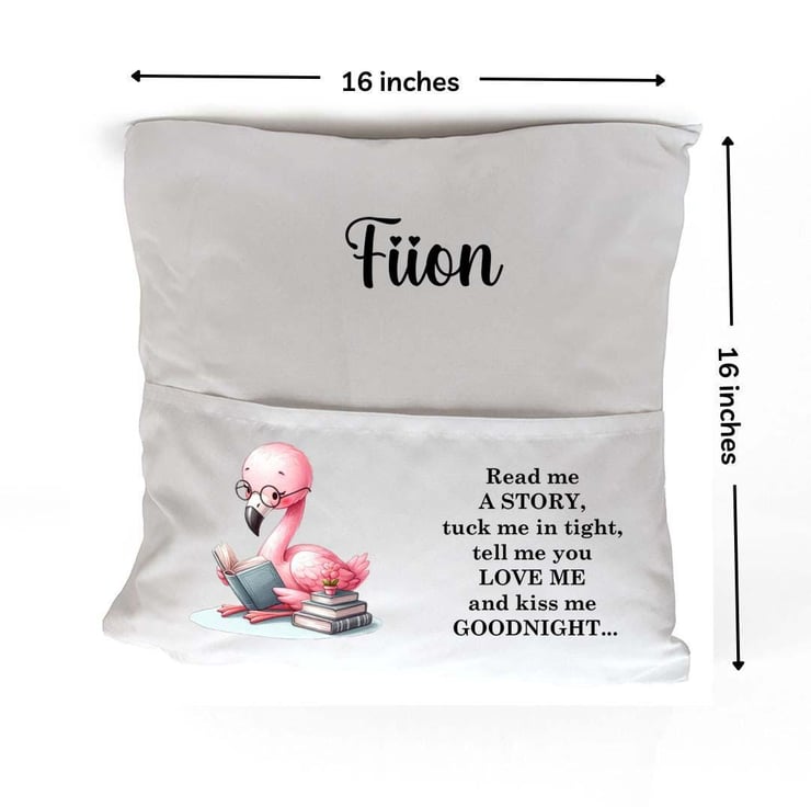 The cushion cover features a charming Flamingo illustration alongside the sweet, bedtime phrase: "Read me a story, tuck me in tight, tell me you love me, and kiss me goodnight." Each cushion cover can be personalized with your child's name, creating a unique, keepsake gift that will be treasured for years to come.