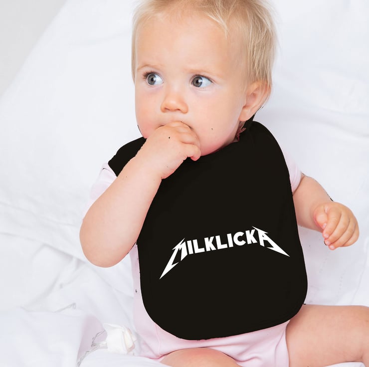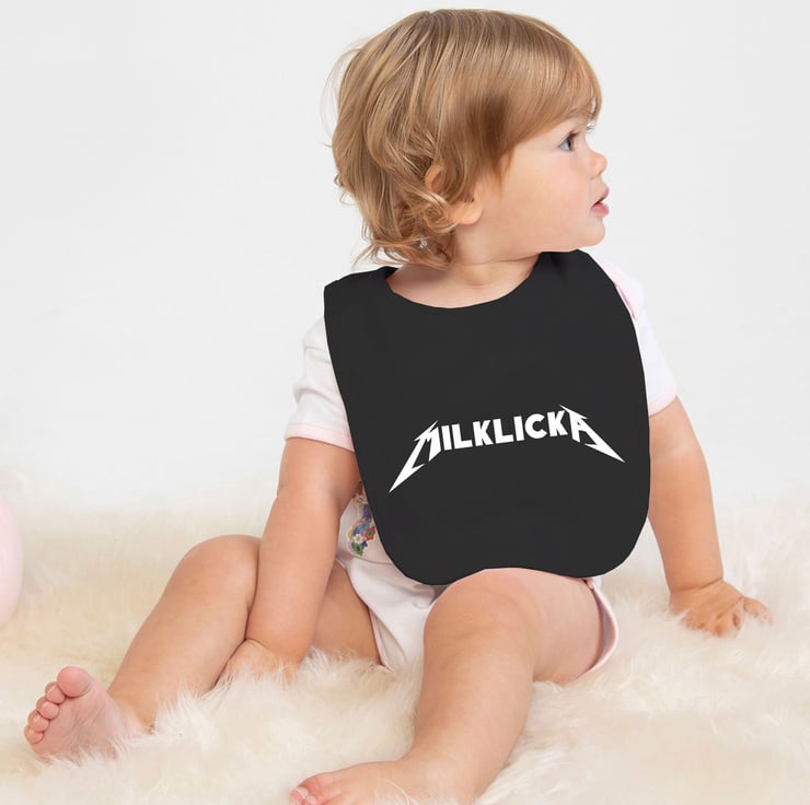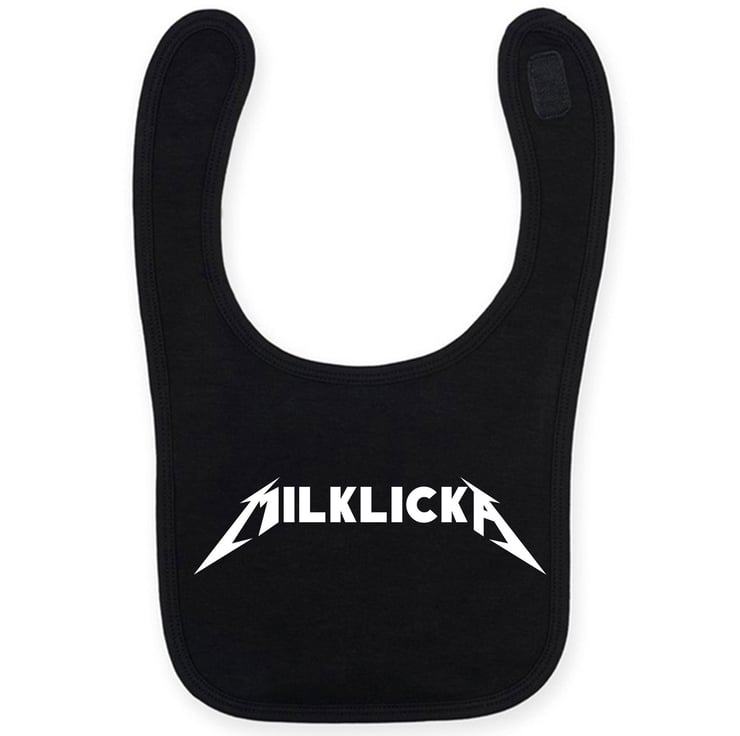 Introducing the Milklicka Baby Bib: A Rockin' Delight for Mini Headbangers!