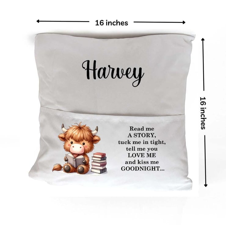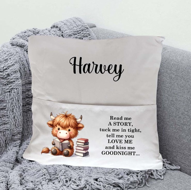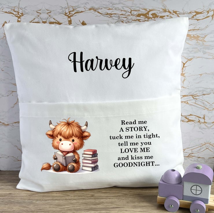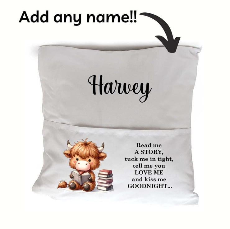 The cushion cover features a charming highland cow illustration alongside the sweet, bedtime phrase: "Read me a story, tuck me in tight, tell me you love me, and kiss me goodnight." Each cushion cover can be personalized with your child's name, creating a unique, keepsake gift that will be treasured for years to come.