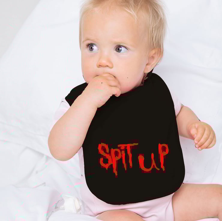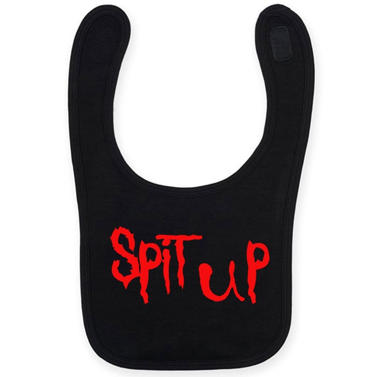 Featuring Slipknot's iconic logo and font style, this bib takes its design cues from the band's dark and aggressive aesthetic. The words "Spit Up" emblazoned across the front create a playful twist that showcases your baby's rock 'n' roll attitude, even during mealtime.