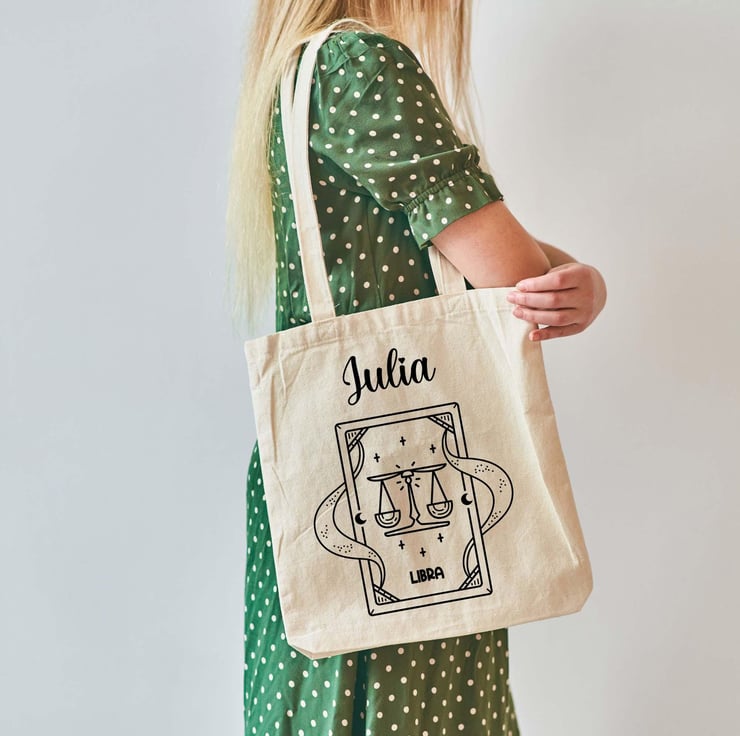 Celebrate balance and elegance with this beautifully designed natural cotton tote bag, featuring a striking Libra illustration. Perfect for astrology lovers, this versatile bag combines style and function with its eco-friendly, durable material and spacious design. Add a personal touch by customizing it with any name, making it an ideal gift for birthdays, special occasions, or as a thoughtful keepsake. Whether for everyday use, shopping, or as a unique statement piece, this tote bag is both practical and meaningful, perfect for anyone who embodies the Libra spirit.