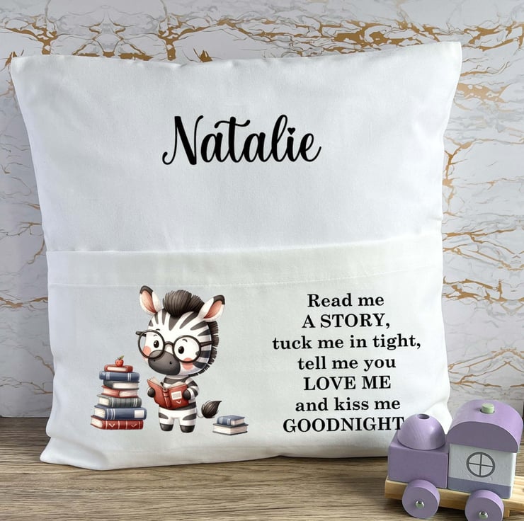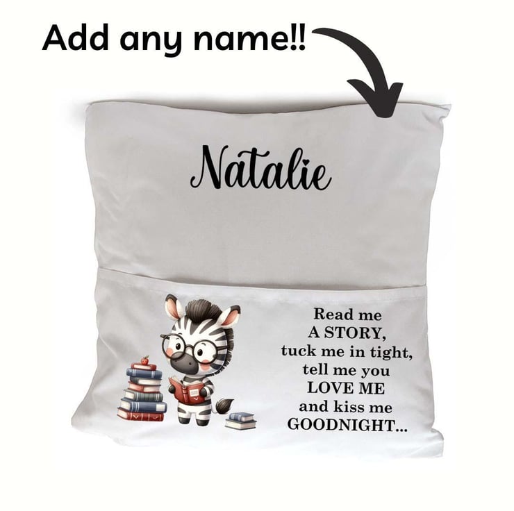 The cushion cover features a charming Zebra illustration alongside the sweet, bedtime phrase: "Read me a story, tuck me in tight, tell me you love me, and kiss me goodnight." Each cushion cover can be personalized with your child's name, creating a unique, keepsake gift that will be treasured for years to come.