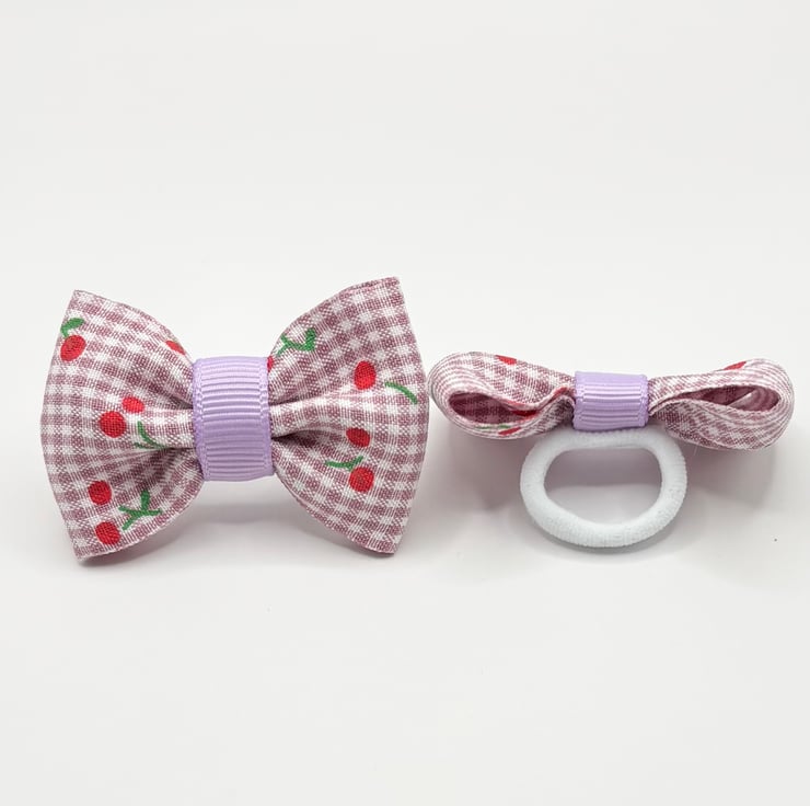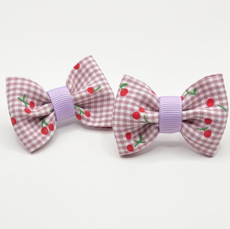 Handmade 100% high quality cotton fabric ribbon, Lilac and White Gingham cherry bows, set on White mini bands for a soft comfortable hold.