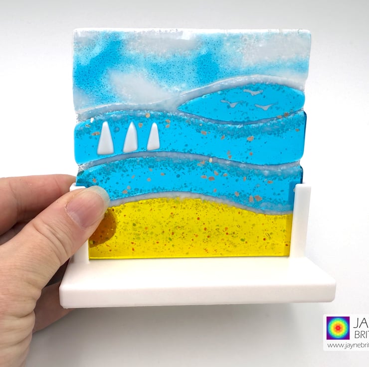 Shown with my own handmade fused glass seascape panel which was cut at 10x10cm and measures 10.2cm after firing.