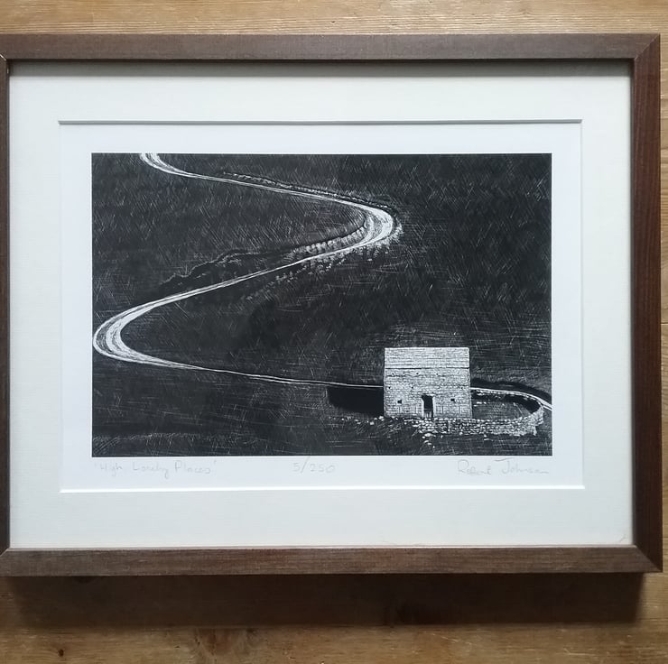 This is a framed fine art print of an original piece of art work done on Scraper Board. The process of creating the work is like drawing in reverse! Instead of making dark marks on white paper, each mark made takes off the outer layer of black ink to reveal the under layer of white china clay. The print depicts a local scene of the Yorkshire Dales in which I live and work.