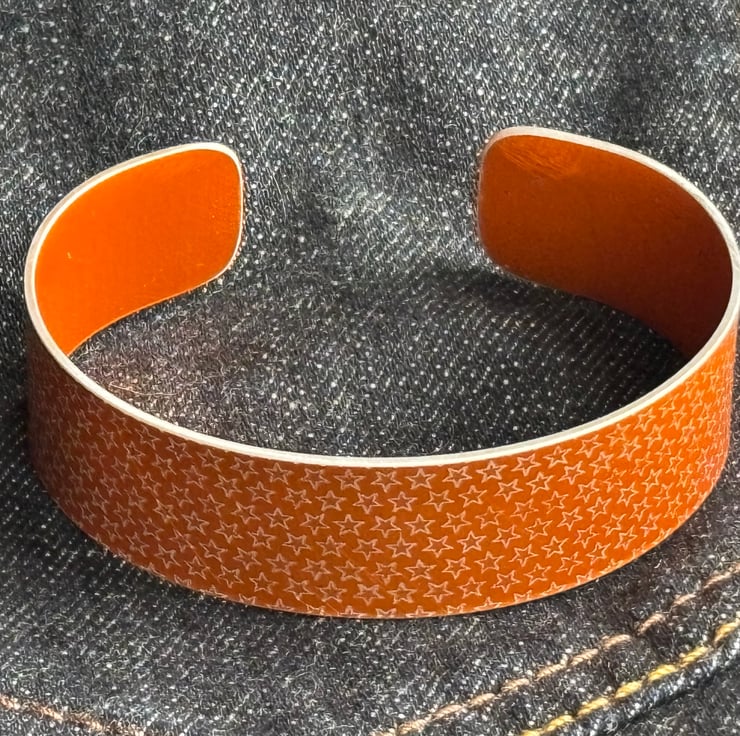 A striking bracelet/cuff made from anodised aluminium with a star pattern designed digitally by me. I made the drawing into a resist and applied it to the metal. I then dye the aluminium, seal it and remove the resist which leaves the pattern showing in the original colour of the metal. The cuff is then made using traditional metalworking techniques.