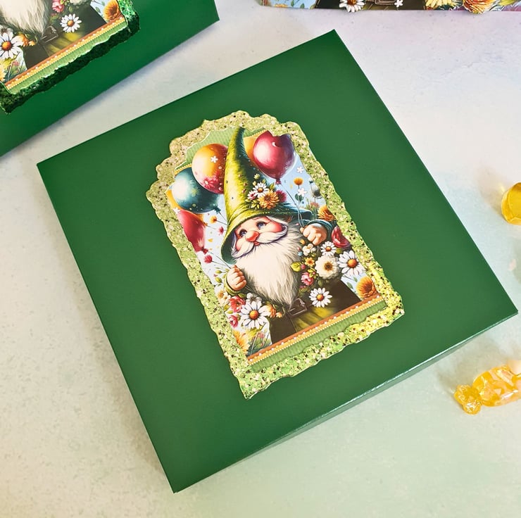 The front panel is shaped with the figure of the Gnome holding the balloons, and has been decoupaged with 2 layers of printed card, raised on foam pads for dimension. Gold glitter accents have been used for the flower centres while a few small, green gems decorate the gnome's hat.