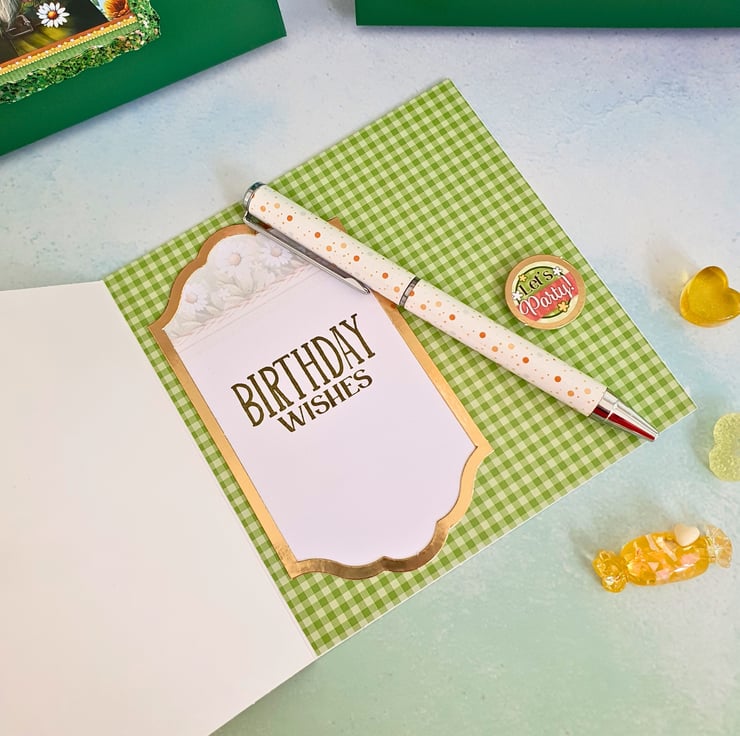 The inside of the card is layered with luxury paper in a green gingham pattern & has a framed insert with the sentiment "Birthday Wishes" stamped on it.