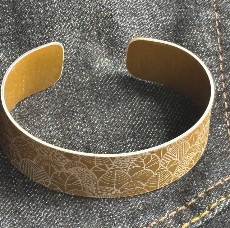 A stylish bracelet/narrow cuff made from anodised aluminium with a print of stylised trees. I drew this pattern digitally, made it into a resist and applied it to the metal. I then dye the aluminium, seal it and remove the resist which leaves the pattern showing in the original colour of the metal. The cuff is then made using traditional metalworking techniques.