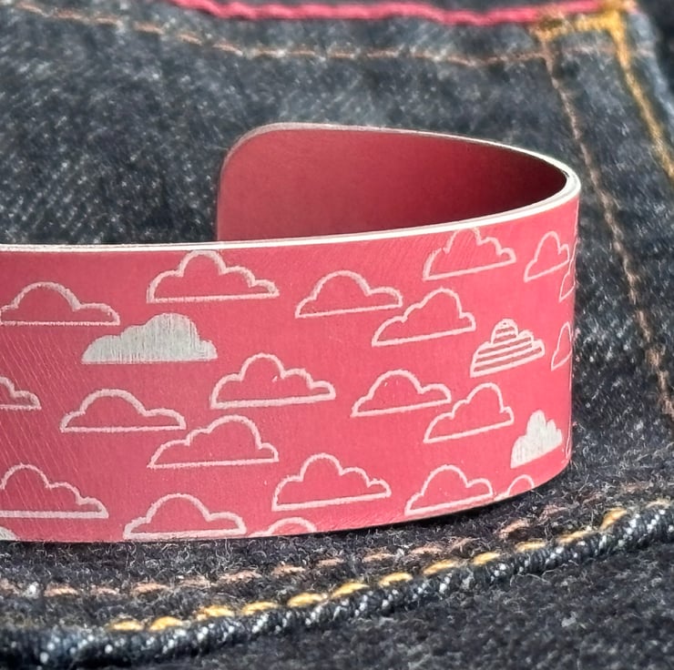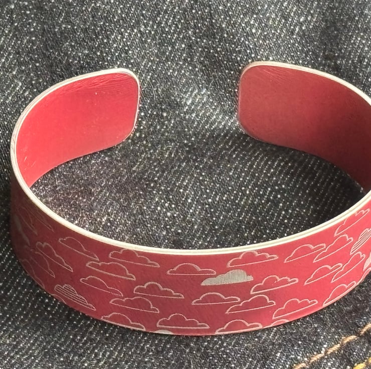 A stylish bracelet/narrow cuff made from anodised aluminium with a mini print of clouds. I drew this pattern digitally, made it into a resist and applied it to the metal. I then dye the aluminium, seal it and remove the resist which leaves the pattern showing in the original colour of the metal. The cuff is then made using traditional metalworking techniques.